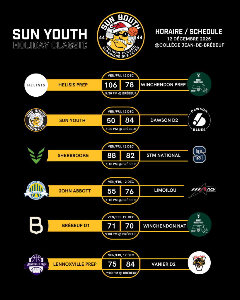 | SUNDAY DECEMBER 14th 2025 | 19 | 11h30 | F | Jean-de-BréBeuf | Collège Saint-Jean Vianney |